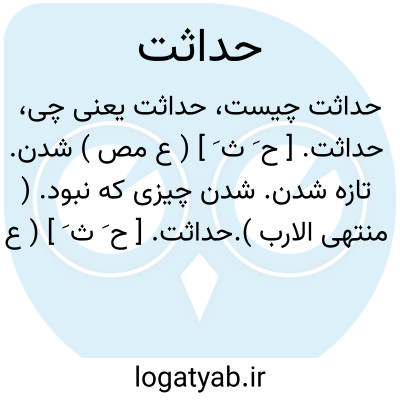 (حَ ثَ ) [ ع. حداثة ] ۱ - (مص ل. ) نو شدن، تازه گردیدن. ۲ - (اِمص. ) نوی، تازگی. ۳ - نوخاستگی، نوجوانی. ۴ - (اِ. ) ابتدای هرچیز، اول هر امر.