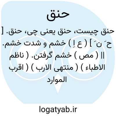 حنق. [ ح َ ن َ ] ( ع اِ ) خشم و شدت خشم. || ( مص ) خشم گرفتن. ( ناظم الاطباء ) ( منتهی الارب ) ( اقرب الموارد ). || سخت کینه شدن و خشم گرفتن. ( المصادر زوزنی ) ( غیاث از شرح نصاب ).