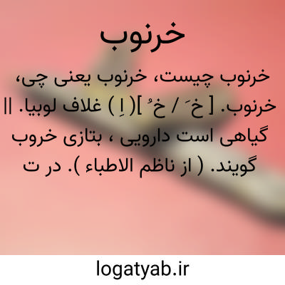( اسم ) ۱ - درختی است از تیر. پروانه واران شبیه بدرخت گردو و دارای گلهای زرد. میوه اش در غلافی دراز شبیه باقلا جای دارد. طعم آن شیرین است و از آن رب سازند. ۲ - قسمی از آن بوته ایست مرتفع و خاردار دارای شاخه های متفرق و گلهای زرد رنگ خرنوب نبطی. ۳ - خرنوب یا خرنوب شامی. واحد وزن معادل یک قیراط بود.