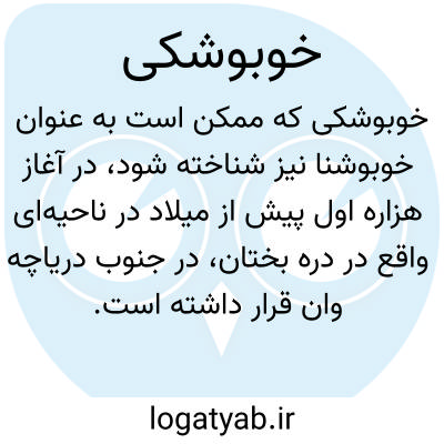 خوبوشکی که ممکن است به عنوان خوبوشنا نیز شناخته شود، در آغاز هزاره اول پیش از میلاد در ناحیهای واقع در دره بختان، در جنوب دریاچه وان قرار داشته است. این منطقه به عنوان یک ناحیه تاریخی و فرهنگی با اهمیت شناخته میشود و شواهدی از زندگی و تمدنهای باستانی را در خود جای داده است. خوبوشکی به نوعی نمادی از فرهنگ و هنر آن دوران به شمار میآید و نشاندهنده تبادلات اجتماعی و اقتصادی میان اقوام مختلف است. در واقع، این ناحیه توانسته است به عنوان یک کانون تجمع جمعیتی و فرهنگی در آن زمان عمل کند و تأثیرات فرهنگی متنوعی را بر جای بگذارد.