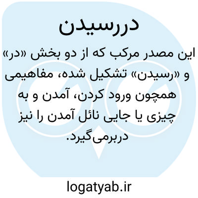 این مصدر مرکب که از دو بخش «در» و «رسیدن» تشکیل شده، مفاهیمی همچون ورود کردن، آمدن و به چیزی یا جایی نائل آمدن را نیز دربرمی‌گیرد. کاربرد آن در زبان فارسی کهن نشان‌دهنده‌ی غنای زبانی و دقت معنا در انتخاب واژگان متناسب با بافت کلام است. با توجه به مستندات موجود در فرهنگ‌های لغت معتبر، «دررسیدن» طیفی از معانی مرتبط با نزدیک شدن، پیوستن و دریافت کردن را پوشش می‌دهد و از جمله مصدرهای پرکاربرد در متون کلاسیک فارسی محسوب می‌شود که امروزه نیز درک صحیح آن برای مطالعه و فهم متون کهن ضروری است.