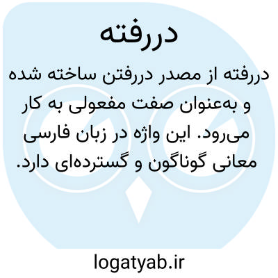 دررفته از مصدر دررفتن ساخته شده و بهعنوان صفت مفعولی به کار میرود. این واژه در زبان فارسی معانی گوناگون و گستردهای دارد که بر اساس بافت جمله و زمینهی کاربرد آن مشخص میشود. در یک نگاه کلی، میتواند به معنای رفته، شده یا درآمده و به درون رفته باشد. همچنین، این واژه در مفهوم فرار کردن و گریختن نیز به کار میرود. در حوزهای دیگر، برای بیان حالت تغییر شکل یافته، پاره شده یا کسر و کمشده مورد استفاده قرار میگیرد؛ برای نمونه، در جملاتی مانند کف فرش دررفته است یا پی و پاچین دررفته نشاندهندهی فرسودگی و تغییر شکل است و در مثال یک خیک روغن غَرم دررفته به معنای کسر شدن و کم شدن مقدار است.