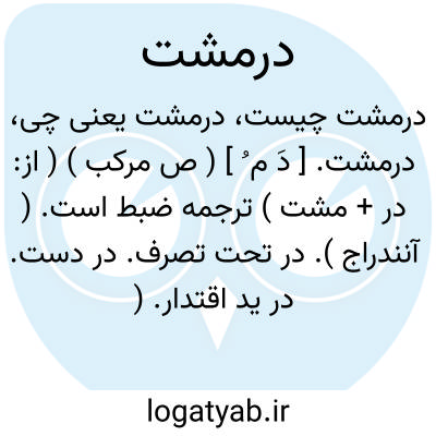 درمشت. [ دَ م ُ ] ( ص مرکب ) ( از: در + مشت ) ترجمه ضبط است. ( آنندراج ). در تحت تصرف. در دست. در ید اقتدار. ( ناظم الاطباء ).