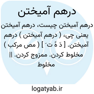 ( درهم آمیختن ) درهم آمیختن. [ دَ هََ ت َ ] ( مص مرکب ) مخلوط کردن. ممزوج کردن. || مخلوط شدن. ممزوج شدن. املاس؛ درهم آمیختن تاریکی. ملابسة؛ درهم آمیختن کار. ( از منتهی الارب ). اعتکار؛ درهم آمیخته شدن تاریکی.
