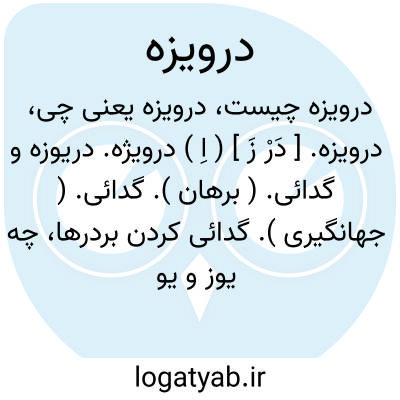 درویزه. [ دَرْ زَ ] ( اِ ) درویژه. دریوزه و گدائی. ( برهان ). گدائی. ( جهانگیری ). گدائی کردن بردرها، چه یوز و یوزه جستجو و دریوزه به معنی جستجو از درها به دریوزه کردن. ( انجمن آرا ) ( آنندراج ). خواهش. استدعا. گدائی و سؤال به کف. ( ناظم الاطباء ). تقاضا: التماس کردند که فلان رنجور است توجه خاطر شریف درویزه می نماید فرمودند اول بازگشت حسنه می باید آنگاه توجه خاطر شکسته. ( بخاری ). در کاسه پیروزه فلک همین یک مشت خاک بدست کرده کز آن درویزه چاشت وشام توان طلبید. ( منشآت خاقانی چ دانشگاه ص 150 ).