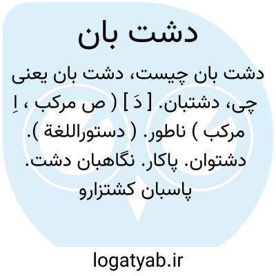 دشتبان. [ دَ ] ( ص مرکب، اِ مرکب ) ناطور. ( دستوراللغة ). دشتوان. پاکار. نگاهبان دشت. پاسبان کشتزارو مزرعه. مأمور محلی ده که وظیفه او حفاظت مزارع دهقانان از ویرانی و دستبرد این و آن است و در بعضی نقاط امور آبیاری را نیز سرپرستی می کند:
