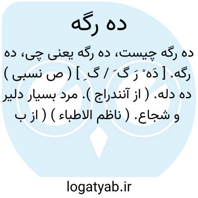 ده رگه. [ دَه ْ رَ گ َ / گ ِ ] ( ص نسبی ) ده دله. ( از آنندراج ). مرد بسیار دلیر و شجاع. ( ناظم الاطباء ) ( از برهان ). || مرد کارکرده. || صاحب غیرت. || حرام زاده. ( ناظم الاطباء ) ( از برهان ) ( از آنندراج ).