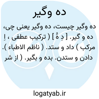 ده و گیر. [ دِ هَُ ] ( ترکیب عطفی، اِ مرکب ) داد و ستد. ( ناظم الاطباء ). دادن و ستدن. بده و بگیر. ( از شرفنامه منیری ). || ده و دار. ( ناظم الاطباء ). بزن و بگیر. هیاهوی دو سپاه درهم افتاده. همهمه و غلغله جنگ: