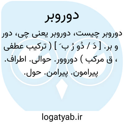 دور و بر. [ دَ / دُو رُ ب َ ] ( ترکیب عطفی، ق مرکب ) دوروور. حوالی. اطراف. پیرامون. پیرامن. حول. گرد. گرداگرد. دورتادور. گردبرگرد. ( یادداشت مؤلف ).