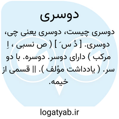 دوسری. [ دُ س َ ] ( ص نسبی، اِ مرکب ) دارای دوسر. دوسره. با دو سر. ( یادداشت مؤلف ). || قسمی از خیمه. ( ناظم الاطباء ) ( از آنندراج ):