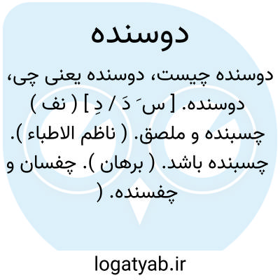 دوسنده. [ س َ دَ / دِ ] ( نف ) چسبنده و ملصق. ( ناظم الاطباء ). چسبنده باشد. ( برهان ). چفسان و چفسنده. ( شرفنامه منیری ). لزج. ( دهار ). لازق. لازب. چسبان. چسبناک. ( یادداشت مؤلف ). شلک؛ گلی بود سیاه و دوسنده. ( لغت فرس اسدی ): و دیگر جای فرمود: انا خلقناهم من طین لازب ( قرآن 11/37 ) و به تازی طین گل باشد و لازب چیزی باشد دوسنده. ( ترجمه تاریخ طبری بلعمی ). و بر ظاهر او [ بر ظاهر سقمونیا ] تریی است دوسنده. ( ذخیره خوارزمشاهی ). تلزج؛ دوسنده بودن. ( منتهی الارب ) ( تاج المصادر بیهقی ). لزوب، لزب؛ دوسنده شدن. ( دهار ). || گل چسبنده. || زمین لغزنده. ( از ناظم الاطباء ) ( برهان ) ( آنندراج ). زمین لخشان. ( از شرفنامه منیری ). چسبناک و لغزنده ( زمین ). || منحنی و کج. || ملحوظ و شوریده. || کوفته و فرسوده. ( ناظم الاطباء ).
