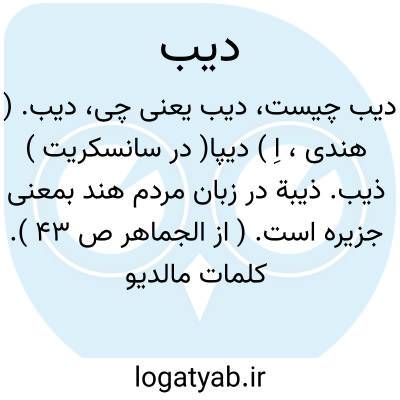 دیب. ( هندی، اِ ) دیپا( در سانسکریت ) ذیب. ذیبة در زبان مردم هند بمعنی جزیره است. ( از الجماهر ص 43 ). کلمات مالدیو، لاکدیو، دیودیپ، ساتادیپ، سرندیب، سنگل دیب، مالدیب ترکیب با این کلمه است. ( دیبجات =مجمعالجزایر ) ( یادداشت مؤلف ). ج، دیبات؛ الدیبات و هی الجزائر. ( ماللهند ص 80 ).