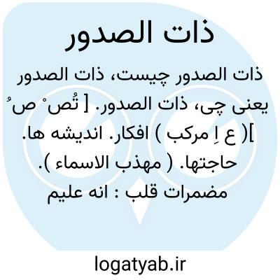 ذات الصدور. [ تُص ْ ص ُ ]( ع اِ مرکب ) افکار. اندیشه ها. حاجتها. ( مهذب الاسماء ). مضمرات قلب: انه علیم بذات الصدور. ( قرآن 5/11 ).