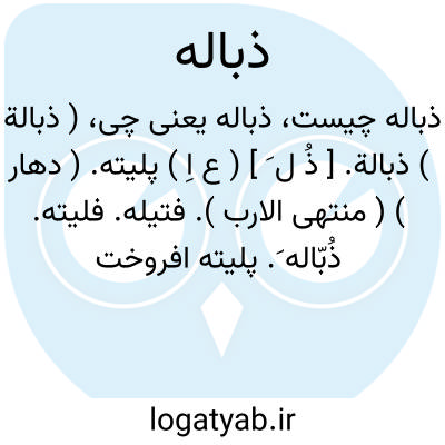 ( ذبالة ) ذبالة. [ ذُ ل َ ] ( ع اِ ) پلیته. ( دهار ) ( منتهی الارب ). فتیله. فلیته. ذُبّاله َ. پلیته افروخته. ج، ذبال. ( مهذب الاسماء ). ذَبائل: