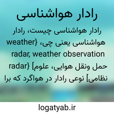 {weather radar, weather observation radar} [حمل ونقل هوایی، علوم نظامی] نوعی رادار در هواگرد که برای دریافت اطلاعات هواشناسی و نشان دادن وضعیت هوای رد سیر (track ) پرواز از آن استفاده می شود متـ. رادار هواشناسی هوابُرد airborne weather radar, AWR