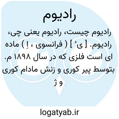 ( اسم ) عنصریست طبیعی و کمیاب و پرقیمت دارای تشعشعی خاص که در ۱۸۹۸ به وسیله مادام کوری و شوهرش در معادن اورانیوم کشف گردیده این عنصر جسمی است سفید رنگ درخشنده ( در تاریکی مانند چراغ میدرخشد ) و موجد حرارت.