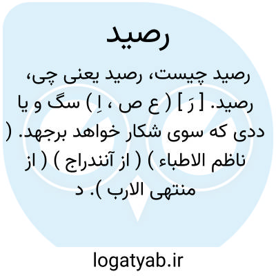رصید. [ رَ ] ( ع ص، اِ ) سگ و یا ددی که سوی شکار خواهد برجهد. ( ناظم الاطباء ) ( از آنندراج ) ( از منتهی الارب ). ددی که سوی شکار خواهد برجهد، گویند: «سَبُع رصید». ( از اقرب الموارد ). || چشم دارنده به چیزی. مراقب. مواظب. ( فرهنگ فارسی معین ).