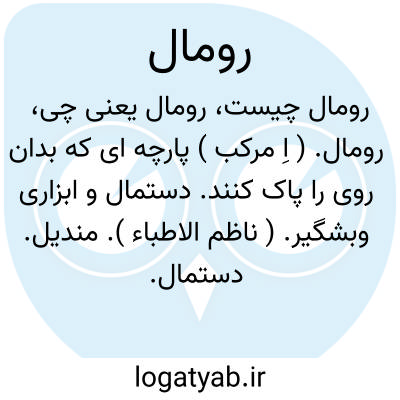 رومال. ( اِ مرکب ) پارچه ای که بدان روی را پاک کنند. دستمال و ابزاری وبشگیر. ( ناظم الاطباء ). مندیل. دستمال. ( لغت محلی شوشتر، نسخه خطی کتابخانه مؤلف ). پارچه ای که بدان روی را از غبارو جز آن پاک کنند. ( آنندراج ). دستمال. دستمال بزرگ:سری که درد نمی کند رومال چرا باید بست. در لهجه مردم چهار محال و پاکستان، دستمال. ( یادداشت مؤلف ).