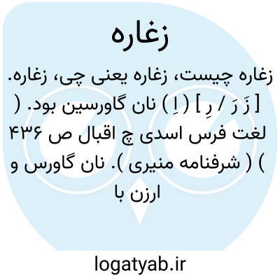 زغاره. [ زَ رَ / رِ ] ( اِ ) نان گاورسین بود. ( لغت فرس اسدی چ اقبال ص 436 ) ( شرفنامه منیری ). نان گاورس و ارزن باشد. ( برهان ) ( آنندراج ) ( ناظم الاطباء ). نانی که از ارزن پزند. ( فرهنگ فارسی معین ). با زای نقطه دار هم هست که بر وزن ملازه ( زغازه ) باشد. ( برهان ) ( آنندراج ):