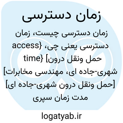 {access time} [حمل ونقل درون شهری-جاده ای، مهندسی مخابرات] [حمل ونقل درون شهری-جاده ای] مدت زمان سپری شده در سفر، از لحظۀ ترک مبدأ تا لحظۀ سوار شدن به خودرو [مهندسی مخابرات] مدت زمانی که از لحظۀ آغاز تقاضای دسترسی تا برقراری ارتباط سپری می شود