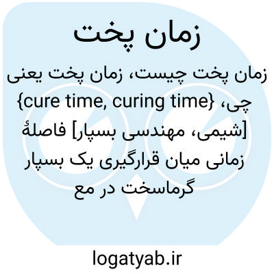 {cure time, curing time} [شیمی، مهندسی بسپار] فاصلۀ زمانی میان قرارگیری یک بسپار گرماسخت در معرض شرایط پخت تا هنگامی که خواص معینی در آن پدید آید