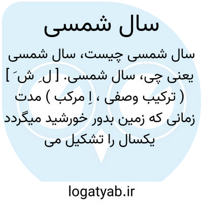 سال شمسی. [ ل ِ ش َ ] ( ترکیب وصفی، اِ مرکب ) مدت زمانی که زمین بدور خورشید میگردد یکسال را تشکیل میدهد که آن را سال شمسی گویند و این مدت دوازده ماه است و دوازده ماه آن عبارت از فروردین و اردیبهشت.... تا اسفند ماه است.