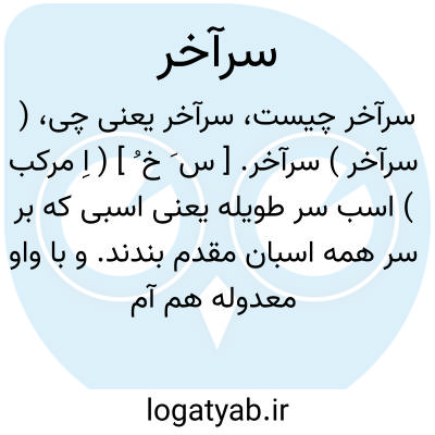 ( سرآخر ) سرآخر. [ س َ خ ُ ] ( اِ مرکب ) اسب سر طویله یعنی اسبی که بر سر همه اسبان مقدم بندند. و با واو معدوله هم آمده است که سرآخور باشد. ( برهان ) ( آنندراج ) ( جهانگیری ):