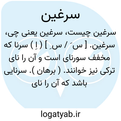 سرغین. [ س َ / س ِ ] ( اِ ) سرنا که مخفف سورنای است و آن را نای ترکی نیز خوانند. ( برهان ). سرنایی باشد که آن را نای ترکی گویند و در اصل سورنای است که در عروسی و عشرت نوازند و آن را سرغینه نیز گفته اند. ( انجمن آرا ) ( آنندراج ):