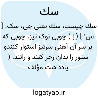 سک. [ س ُ ] ( اِ ) چوبی نوک تیز. چوبی که بر سر آن آهنی سرتیز استوار کنندو ستور را بدان زجر کنند و رانند. ( یادداشت مؤلف ).چوبی بمقدار وجبی که بر سر آن آهنی نوک تیز چون جوالدوزی استوار کنند و خربندگان بدان خر را رانند. ( یادداشت مؤلف ). || نکبت و فلاکت. ( برهان ). || مرکبی است و گویند عصاره آمله، مقوی دل،خوشبو. ( الفاظ الادویه ). عصاره آمله. ( از اختیارات بدیعی ) ( برهان ) ( تحفه حکیم مؤمن ) ( منتهی الارب ) ( ازآنندراج ). سک اصلی از آمله است و بعضی از مازو کنند. گرم است بدرجه اول و خشک بدرجه دوم. درد عصب را سود دارد قابض است و زداینده. ( ذخیره خوارزمشاهی ).