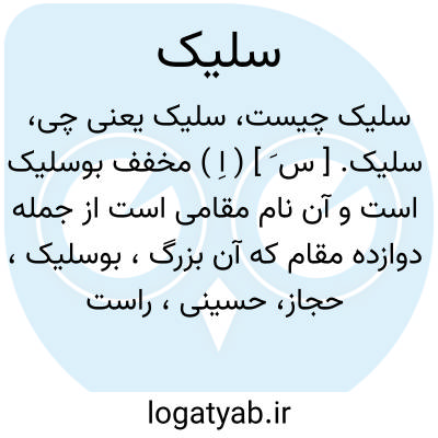 سلیک. [ س َ ] ( اِ ) مخفف بوسلیک است و آن نام مقامی است از جمله دوازده مقام که آن بزرگ، بوسلیک، حجاز، حسینی، راست، رهاوی، زنگوله، صفاهانک، عراق، عشاق، کوچک و نوا باشد. ( برهان ) ( آنندراج ). بوسلیک. مقامی از دوازده مقام موسیقی. ( ناظم الاطباء ).