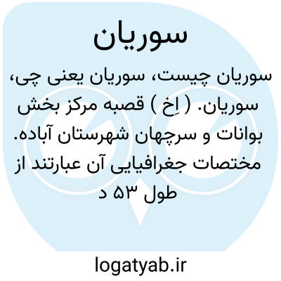 سوریان. ( اِخ ) قصبه مرکز بخش بوانات و سرچهان شهرستان آباده. مختصات جغرافیایی آن عبارتند از طول 53 درجه و 40 دقیقه از گرینویچ، عرض 30 درجه 28 دقیقه و ارتفاع آن از سطح دریا حدود 2270متر است. سکنه آن مطابق آمار 1816 تن است. آب مشروب قصبه از رودخانه بوانات و قنات تأمین میگردد. شغل آنان زراعت و باغداری و کسب میباشد. از ادارات دولتی بخشداری، دارایی، ژاندارمری، آمار، پست، بهداری و در حدود سی باب دکان ویک دبستان دارد. ( از فرهنگ جغرافیائی ایران ج 7 ).