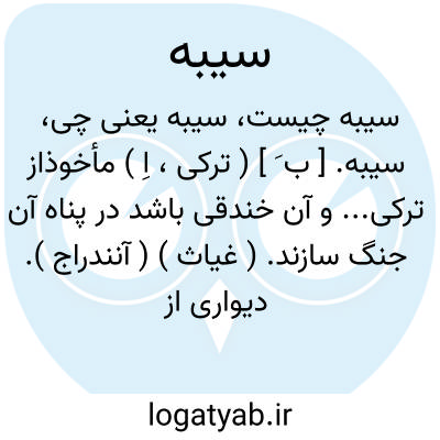 سیبه. [ ب َ ] ( ترکی، اِ ) مأخوذاز ترکی... و آن خندقی باشد در پناه آن جنگ سازند. ( غیاث ) ( آنندراج ). دیواری از چوب و علف دور قلعه و شهر، چپر، سور. ( فرهنگ فارسی معین ). رجوع به سیبا شود. || گلوله ای بود از زر احمر که پادشاهان در دست غلطاندندی، چنانکه بعدها لخلخله عنبرین به دست گرفتندی. ( از الجماهر بیرونی ص 235 ). || ( اصطلاح ارتش ) کتیبه. ستون. ( یادداشت بخط مؤلف ).