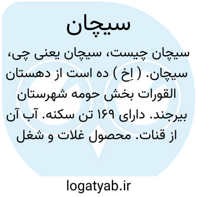 سیچان. ( اِخ ) ده است از دهستان القورات بخش حومه شهرستان بیرجند. دارای 169 تن سکنه. آب آن از قنات. محصول غلات و شغل اهالی زراعت است. ( از فرهنگ جغرافیائی ایران ج 9 ).