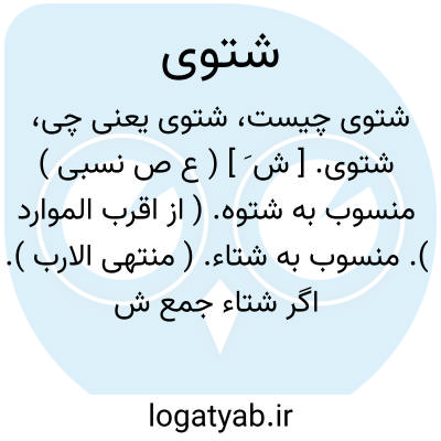شتوی. [ ش َ ] ( ع ص نسبی ) منسوب به شتوه. ( از اقرب الموارد ). منسوب به شتاء. ( منتهی الارب ). اگر شتاء جمع شَتوة باشد منسوب به آن شَتَوی خواهد بود. ( از متن اللغة ). و رجوع به شَتَوی شود.