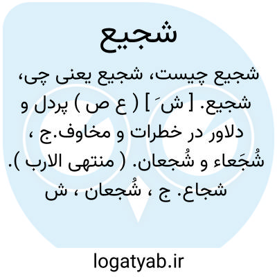 شجیع. [ ش َ ] ( ع ص ) پردل و دلاور در خطرات و مخاوف.ج، شُجَعاء و شُجعان. ( منتهی الارب ). شجاع. ج، شُجعان، شِجاع، شُجَعاء، اءَشجِعَة. ( از اقرب الموارد ).