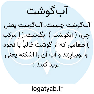 ( آبگوشت ) آبگوشت.( اِ مرکب ) طعامی که از گوشت غالباً با نخود و لوبیاپزند و آب آن را اشکنه یعنی ترید کنند: