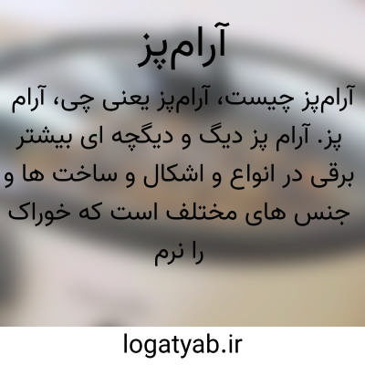 آرام پز. آرام پز دیگ و دیگچه ای بیشتر برقی در انواع و اشکال و ساخت ها و جنس های مختلف است که خوراک را نرم نرم و در دمای کم، ( بین ۱۷۰ تا ۲۸۰درجه فارنهایت معادل ۷۶ تا ۱۳۷ درجه سانتیگراد ) با مصرف ناچیز انرژی و حفظ خواص طبیعی می پزد. در نخستین سالهای دهه هشتاد بنگاه سازنده لوازم خانگی ناکسون شیکاگو این وسیله را ساخت و رقابت میان سازندگان گوناگون با ارائه نو آوری های رنگارنگ بر سر به دست گرفتن بازار آغاز شد. این وسیله، به خصوص نوع رقومی ( دیجیتالی اش ) برای زنان شاغل کمک بزرگی است.