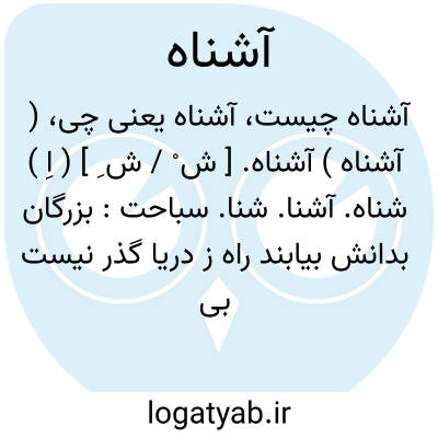 ( آشناه ) ( صفت ) ۱ - شناخته شناسنده مقابل بیگانه غریب نا آشنا. ۲- خویش قریب نزدیک. ۳- دوست یار. ۴ - موافق سازگار. ۵ - معرف معدل مزکی. ۶ - مطلع بامری عارف از کاری: آب آشنا.