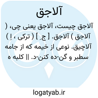 ( آلاجق ) آلاجق. [ ج ِ ] ( ترکی، اِ ) آلاچیق. نوعی از خیمه که از جامه سطبر و گن-ده کنن-د. || کلبه ها که به صورت خیمه های تاتار باشد.