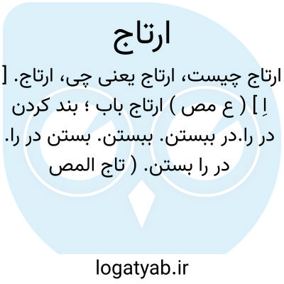 ارتاج. [ اِ ] ( ع مص ) ارتاج باب؛ بند کردن در را.در ببستن. ببستن. بستن در را. در را بستن. ( تاج المصادر بیهقی ). || ارتاج دجاجه؛ پر شدن شکم مرغ از تخم. پر شدن شکم ماکیان از بیضه. پربیضه شدن شکم مرغ. || ارتاج بحر؛ جوش زدن دریا و بسیار شدن آب آن پس فروبردن همه چیز را. || ارتاج ثلج؛ پیوسته باریدن برف. || ارتاج اَتان؛ باردار شدن ماچه خر. باردار شدن ماده خر. || ارتاج ِ خِصب؛ تمام گرفتن زمین را ارزانی و فراوانی و فراخی. || بسته شدن سخن بر کسی. بسته شدن سخن بر مردم. ( زوزنی ). || بسته گردیدن رحم. || ارتاج ناقه؛ نطفه نپذیرفتن آن. || ارتاج سنة؛ تمام سال بقحط گذشتن.