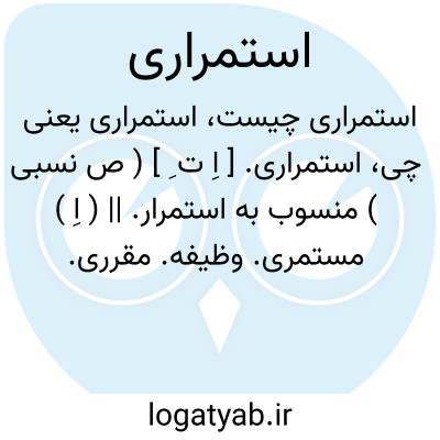 ( صفت اسم ) منسوب به استمرار. ۱ - چیزی که پیوستگی و استمرار داشته باشد. ۲ - مستمری وظیفه مقرری. ۳ - حالتی است از فعل که دوام و استمرار معنی فعل را در زمان گذشته یا حال میرساند. یا ماضی استمراری. فعل ماضی که در زمان گذشته دوام و استمرار داشته باشد و علامت آن ( همی ) ( در قدیم )و ( می ) ( در قدیم و عصر حاضر ) است که بر سر فعل در میاید وگاه نیز ( ی ) بتنهایی در آخر فعل در میامده و زمانی ( ی ) در آخر و ( می ) بر سر فعل افزوده میشده است: همی رفت می رفت رفتی می رفتی. یا مضارع استمراری. فعل مضارع که در زمان حال دوام و استمرار داشته باشد و علامت آن ( همی ) ( در قدیم ) و ( می ) ( در قدیم و عصر حاضر ) است که بر سر فعل در میاید: همی رود می رود.