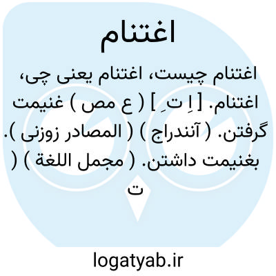 اغتنام. [ اِ ت ِ ] ( ع مص ) غنیمت گرفتن. ( آنندراج ) ( المصادر زوزنی ). بغنیمت داشتن. ( مجمل اللغة ) ( تاج المصادر بیهقی ). غنیمت شمردن. ( منتهی الارب ). افتراص. ( تاج المصادر بیهقی ). انتهاز. ( یادداشت بخط مؤلف ). غنیمت شمردن. ( منتهی الارب ) ( از اقرب الموارد ): شمس المعالی در اکرام مقدم و احترام جانب و اغتنام مورد او همه غایتی رسید. ( ترجمه تاریخ یمینی ص 43 ). || غنیمت گرفتن از کنار. ( آنندراج ) ( یادداشت بخط مؤلف ). || انتهاز غنم؛ بدست آوردن گوسفند. ( از اقرب الموارد ).