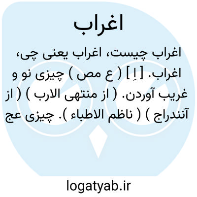 اغراب. [ اِ ] ( ع مص ) چیزی نو و غریب آوردن. ( از منتهی الارب ) ( از آنندراج ) ( ناظم الاطباء ). چیزی عجیب آوردن: اغرب الرجل اتی بشی غریب. ( از اقرب الموارد ). غریب آوردن. ( تاج المصادر بیهقی ). || دور شدن: اغرب عنی؛ ای تباعد. ( از منتهی الارب ). || دور ساختن: اغربه؛ نحاه. ( از اقرب الموارد ). || سخت گردیدن درد کسی: اغرب الرجل اغرابا. ( منتهی الارب ) ( از ناظم الاطباء ). سخت شدن درد بیمار: اغرب المریض ( مجهولاً )؛ اشتد وجعه. ( از اقرب الموارد ). || کار زشت کرده شدن با کسی: اغرب علیه؛ کار زشت کرده شد با وی. ( از منتهی الارب ) ( ناظم الاطباء ). عمل بدی با کسی شدن: اغرب علی فلان؛ صنع به صنیع قبیح. ( از اقرب الموارد ). || سپیدلب یا سپیدکرانه چشم گردیدن اسب: اغرب الفرس. در این سه معنی بصیغه مجهول استعمال میشود. ( منتهی الارب ) ( از اقرب الموارد ). بسیار شدن سپیدی و فراگرفتن آن چشم اسب را: اغرب الفرس ( مجهولاً )؛ فشت غرته و اخذت عینیه. ( از اقرب الموارد ). || بمغرب درآمدن.( منتهی الارب ) ( ناظم الاطباء ). بغرب درآمدن قوم: اغرب القوم؛ اتوا الغرب. ( از اقرب الموارد ). || غریب گردیدن. ( از منتهی الارب ) ( ناظم الاطباء ). غریب شدن. ( آنندراج ). غریب گشتن. ( از تاج المصادر بیهقی ). دور رفتن در بلاد: اغرب زید؛ امعن فی البلاد. یقال: اغرب القوم اذا انتووا. ( از اقرب الموارد ). || پر کردن مشک و جز آن را. ( منتهی الارب ) ( ناظم الاطباء ). پر کردن مشک را و جز آن. ( آنندراج ). پر کردن مشک. ( تاج المصادر بیهقی ). پر کردن حوض: اغرب الحوض؛ ملأه. ( از اقرب الموارد ). || بسیار گردیدن آب. ( از منتهی الارب ) ( آنندراج ) ( از ناظم الاطباء ). || بسیار کردن آب و گل اطراف حوض: اغرب الساقی؛ اکثر الغرب؛ ای ما حول الحوض من الماء و الطین.( از اقرب الموارد ). || خوب و نیکو شدن حال. ( منتهی الارب ) ( آنندراج ) ( از ناظم الاطباء ). بسیار گردیدن مال و نیکو شدن حال: اغرب فلان؛ کثر ماله و حسن حاله. ( از اقرب الموارد ). || زیاده کردن اسب رفتار را. ( آنندراج ) ( از منتهی الارب ) ( ناظم الاطباء ). بسیار دویدن اسب: اغرب الفرس فی جریه؛ اکثر. ( از اقرب الموارد ). || بسیار خندیدن و مبالغه نمودن در آن. ( منتهی الارب ) ( آنندراج ) ( ناظم الاطباء ). مبالغه کردن در خنده: اغرب فلان؛ بالغ فی الضحک. ( از اقرب الموارد ). || راندن سوار اسب را تا هلاک گردد: اغرب الراکب فرسه؛ اجراه الی ان یموت. ( از اقرب الموارد ). جراء الراکب الفرس حتی یموت. ( منتهی الارب ). || سفر دور و دراز کردن. ( منتهی الارب ) ( آنندراج ) ( ناظم الاطباء ). || هویداگردیدن سپیدی پیشانی اسب. ( منتهی الارب ) ( آنندراج ) ( ناظم الاطباء ). || فصیح و نیکوگفتار شدن: اغرب؛ فصح. و قال بالغرائب. ( از اقرب الموارد ). || سپید شدن بنهای ران مرد: اغرب الرجل؛ ابیضت ارفاغه. ( از اقرب الموارد ). || ( ع اِ ) سپیدی بن ران. ( منتهی الارب ) ( آنندراج ) ( ناظم الاطباء ).