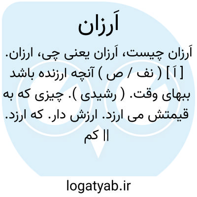 ارزان. [ اَ ] ( اِخ ) ( دشت... ) موضعی بین جزجیرکان و کازرون فارس. رجوع به فارسنامه ابن البلخی چ کمبریج ص 163 شود. ظاهراً مراد دشت ارژن است.، ار زان. [ اَ ] ( حرف ربط + حرف اضافه + صفت / ضمیر ) مخفف ِ ( ( اگر از آن ) ). ( مؤید الفضلاء ).