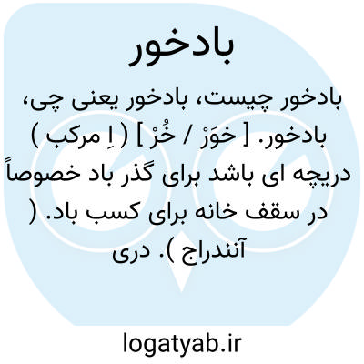 بادخور. [ خوَرْ / خُرْ ] ( اِ مرکب ) دریچه ای باشد برای گذر باد خصوصاً در سقف خانه برای کسب باد. ( آنندراج ). دریچه ای که در بالای عمارت جهت تجدید هوا قرار دهند. ( ناظم الاطباء ). سوراخ و مدخل برای درآمدن هوا، سوراخی برای تجدید هوا. بادرو. بادگیر. منفذ. مجرای هوا. رجوع به بادگیر شود. || خانه تابستانی. ( آنندراج ). || هما را گویند که استخوان میخورد. || طایریست که پیوسته در هوا میباشد. ( آنندراج ). ظاهراً مرادف بادخورک است. رجوع به بادخورک و بادخوار شود. || دقیقه زمان. || بادخایه. ( آنندراج ). رجوع به بادخایه، بادخایگی، باد خصیه، بادخوار، غری، فتق و دبه خایگی شود. || مرضی است که از آن موی اسب بریزد که آنرا بادخور و بادخوره گویند. باقر کاشی گوید: