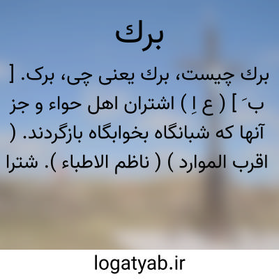 برک. [ ب َ ] ( ع اِ ) اشتران اهل حواء و جز آنها که شبانگاه بخوابگاه بازگردند. ( اقرب الموارد ) ( ناظم الاطباء ). شتران اهل خبا و غیر آن ها که شبانگاه بخوابگاه بازگردند یا گروه شتران فروخفته یا شتران بسیار. ( منتهی الارب ). بارک. بارکة. ( منتهی الارب ) ( آنندراج ). ج، بروک. ( منتهی الارب )( مهذب الاسماء ). || سینه یا باطن سینه. ( منتهی الارب ) ( ناظم الاطباء ). گرداگرد سینه. ( مهذب الاسماء ). || پوست سینه شتر که در خفتن ملصق بزمین باشد. ( منتهی الارب ) ( آنندراج ) ( ناظم الاطباء ).