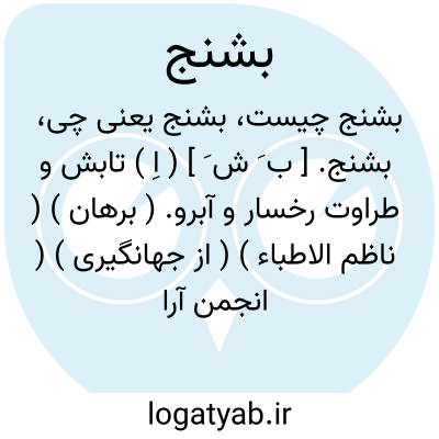 بشنج. [ ب َ ش َ ] ( اِ ) تابش و طراوت رخسار و آبرو. ( برهان ) ( ناظم الاطباء ) ( از جهانگیری ) ( انجمن آرا ). طراوت رخسار و آب روی. ( از آنندراج ). تابش روی باشد. ( سروری ). طراوت رخسار و آب رو. ( رشیدی ) ( مؤید الفضلاء ) ( فرهنگ نظام ). تاب روی. ( شرفنامه منیری ). آب و رنگ رخسار.تر و تازگی رخسار. || از ابزارهای نساجی است. ( شعوری ج 1 ورق 154 و 201 ). رجوع به بشنجه شود.
