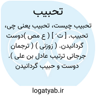 تحبیب. [ ت َ ] ( ع مص )دوست گردانیدن. ( زوزنی ) ( ترجمان جرجانی ترتیب عادل بن علی ). دوست و حبیب گردانیدن کسی را. ( منتهی الارب ) ( آنندراج ) ( ناظم الاطباء ) ( از اقرب الموارد ) ( از قطر المحیط ). دوست شدگی. دوستی آوردن میان دو نفر و زیادتر و دفع دشمنی و مخاصمت نمودن از میان آنها. ( ناظم الاطباء ). دوستی آوردن. بدوستی داشتن. دوستی افکندن.