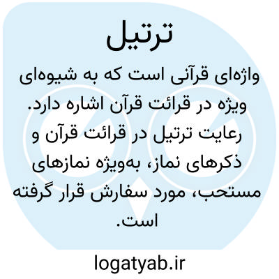 [ویکی فقه] ترتیل (قرآن). ترتیل، واژه ای قرآنی به معنای شیوه خاص قرائت قرآن می باشد. رعایت ترتیل در قرائت و ذکرهای نماز مستحب است.