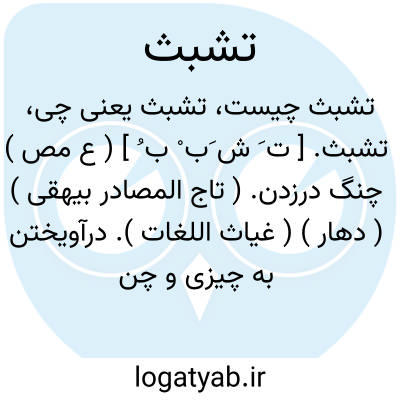 تشبث. [ ت َ ش َب ْ ب ُ ] ( ع مص ) چنگ درزدن. ( تاج المصادر بیهقی ) ( دهار ) ( غیاث اللغات ). درآویختن به چیزی و چنگ درزدن. ( منتهی الارب ) ( ( ناظم الاطباء ) ( از آنندراج ). دست درزدن به چیزی و تمسک شدید. ( از متن اللغة ). دست درزدن به چیزی. ( از اقرب الموارد ) ( از المنجد ): بکتوزون روی بدو آورد تا خطه از تشبث او بیرون کند.( ترجمه تاریخ یمینی نسخه خطی کتابخانه سازمان ص 162 ) روی به نیشابور نهاد تا منصب قدیم خویش نگاهداردو تشبثی که به نا استحقاق به شغل او حادث گشته است زائل گرداند. ( ترجمه تاریخ یمینی چ 1 تهران ص 203 ).